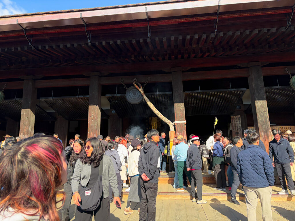 多くの参拝者で賑わう舞台。ご本尊の千手観音菩薩をお祀りしています。